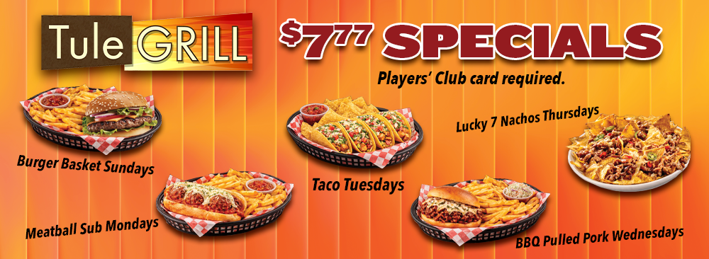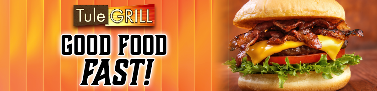 The Tule Grill offers a variety of snacks, sandwiches, burgers, and salads to grab on the go. Serving breakfast from 9AM to 11AM!